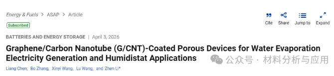 自然环境中蕴藏着大量未开发的能源,因此从清洁、可再生的资源中获取电力已成为全球当务之急。一种新型的水蒸发诱导发电技术已引起广泛关注。本文,清华大学李震 教授团队在《Energy Fuels》期刊发表名为“Graphene/Carbon Nanotube (G/CNT)-Coated Porous Devices for Water Evaporation Electricity Generation and Humidistat Applications”的论文,研究提出了一种多孔发电装置,通过将石墨烯/碳纳米管(G/CNTs)直接涂覆在经水刺法制备的多孔纤维织物上,该装置可在水刺激下发电。